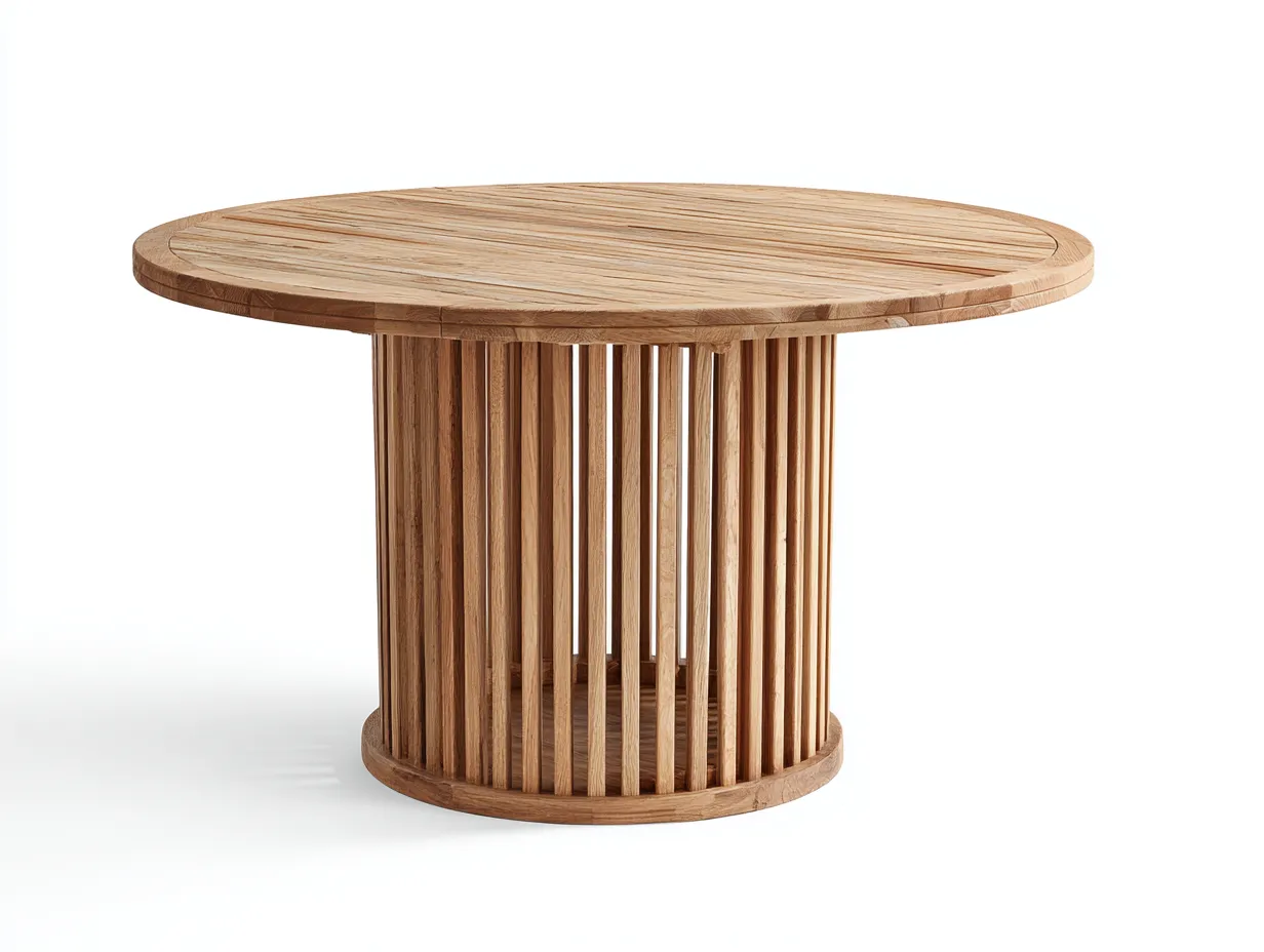 Der Tisch besteht aus Massivholz in Naturfarbe. Die Oberfläche zeigt eine sichtbare Holzmaserung, die dem Möbelstück eine warme und authentische Ausstrahlung verleiht. Die sorgfältige Verarbeitung der Tischplatte sowie des zylindrischen Sockels sorgt für eine stabile Struktur und eine gleichmäßige Optik.