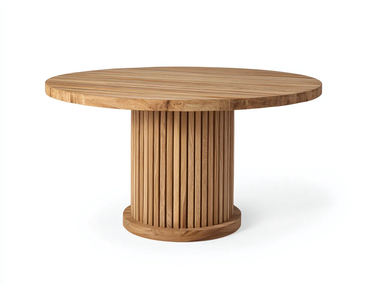 Der Gartentisch besteht aus Massivholz in Naturfarbe. Die Oberfläche zeigt eine natürliche Holzstruktur, die dem Möbelstück eine warme Ausstrahlung verleiht. Die Tischplatte sowie das zylindrische Untergestell sind stabil gefertigt und sorgen für eine gleichmäßige und solide Konstruktion.