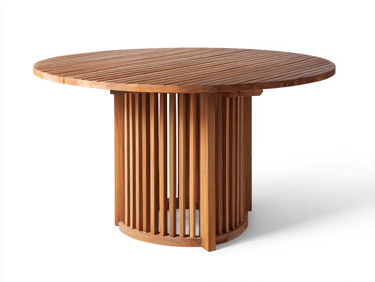 Die runde Tischform erleichtert eine ausgewogene Sitzanordnung und unterstützt eine angenehme Kommunikation bei gemeinsamen Mahlzeiten. Das mittige Untergestell sorgt für sicheren Stand und ermöglicht gleichzeitig eine komfortable Beinfreiheit. Das klare Design passt zu verschiedenen Gartenmöbeln und Outdoor-Stühlen.