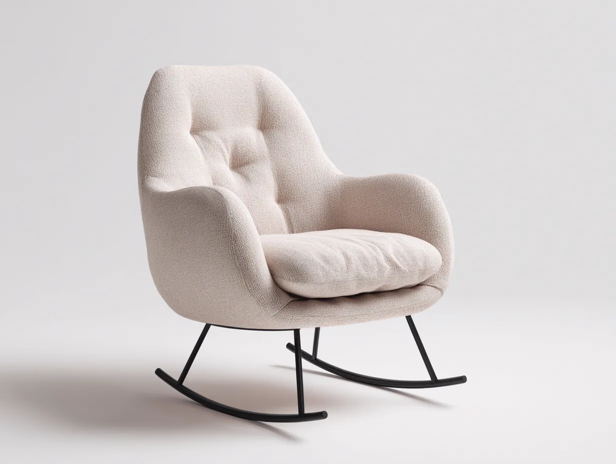 Die ergonomische Form der Rückenlehne unterstützt den Oberkörper bei längerer Nutzung. Die integrierten Armlehnen tragen zu einer entspannten Sitzposition bei. Das gebogene Schaukelgestell ermöglicht sanfte Bewegungen und macht den Stuhl zu einer passenden Wahl für Wohnbereiche, Leseplätze oder ruhige Ecken.