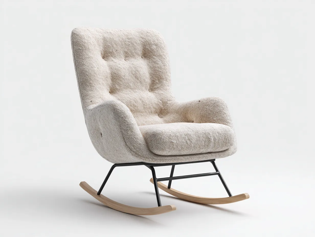 Die ergonomisch geformte Rückenlehne unterstützt eine natürliche Sitzposition. Die integrierten Armlehnen erhöhen den Komfort im Alltag. Das stabile Schaukelgestell mit Holzkufen ermöglicht ruhige Bewegungen und eignet sich für entspannte Momente im Wohnzimmer oder in einer Leseecke.