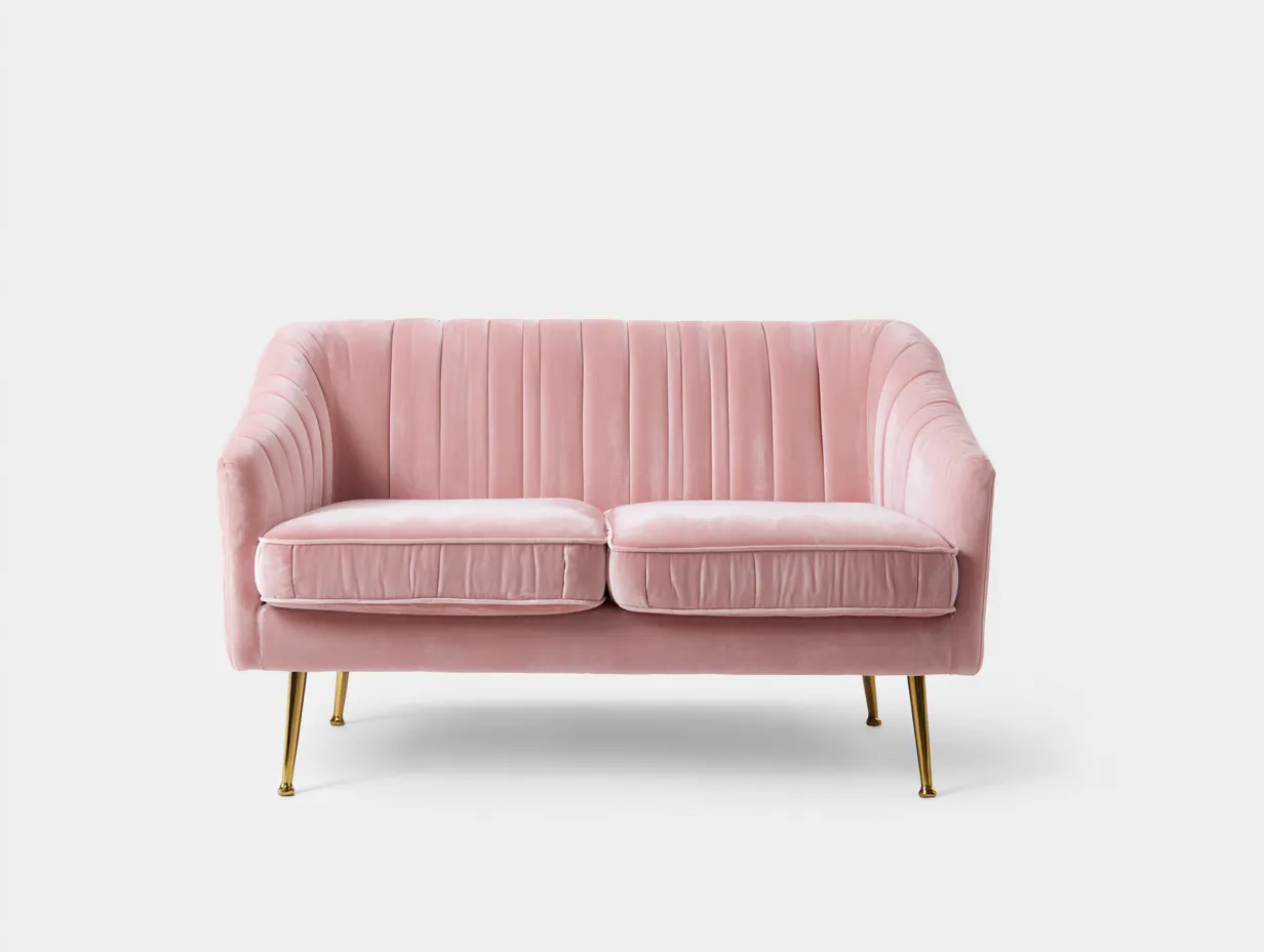 Der Bezug besteht aus weichem Samt in Rosa und sorgt für eine angenehme Haptik. Die stabile Rahmenkonstruktion unterstützt eine zuverlässige Nutzung im Alltag. Schlanke Metallfüße in goldfarbener Optik bieten stabilen Stand und ergänzen das moderne Design.