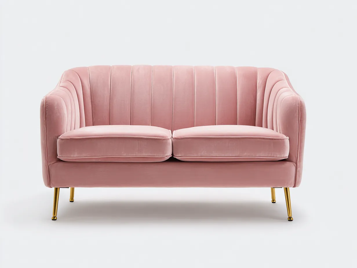 Der Bezug besteht aus weichem Samt in Rosa und bietet eine angenehme Oberfläche. Die stabile Rahmenkonstruktion sorgt für zuverlässige Stabilität im Alltag. Die schlanken Metallfüße in goldfarbener Optik unterstützen die Konstruktion und setzen einen modernen Akzent.